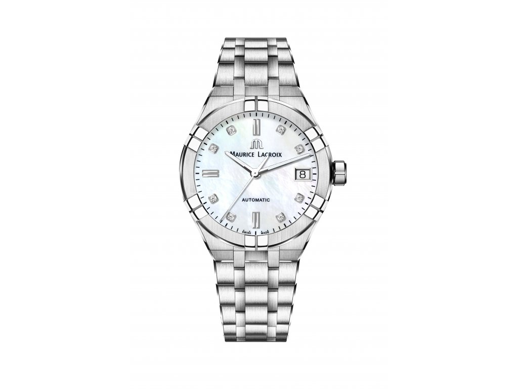 Elegantní Aikon potěší všechny dámy, které mají rády automatické strojky. Půvab hodinkám dodává něžný perleťový číselník s diamanty.