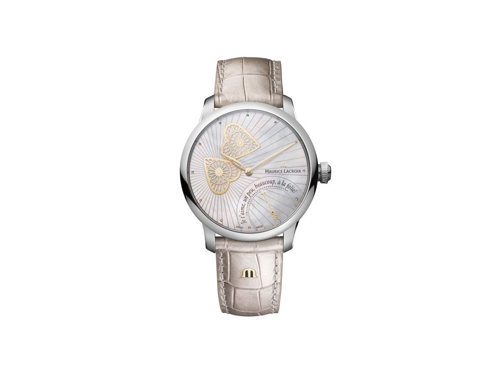 Dvě srdce zaklesnutá do sebe nahrazují klasickou vteřinovou ručku. Každý zub srdce má svůj vlastní profil, který zapadá do svého sousedního protějšku s dokonalou přesností. V poetickém zpracování pokračuje Maurice Lacroix retrográdní stupnicí rezervy chodu: Je t'aime un peu, be auncoup, á la folie, v překladu: Miluji tě trochu, hodně, šíleně. Stupnici, jak jinak, zobrazuje ručka ve tvaru amorova šípu.