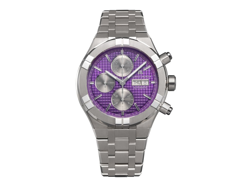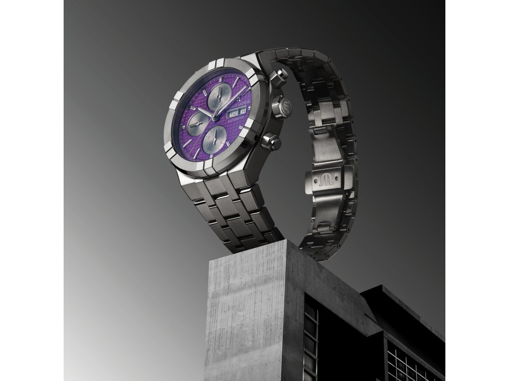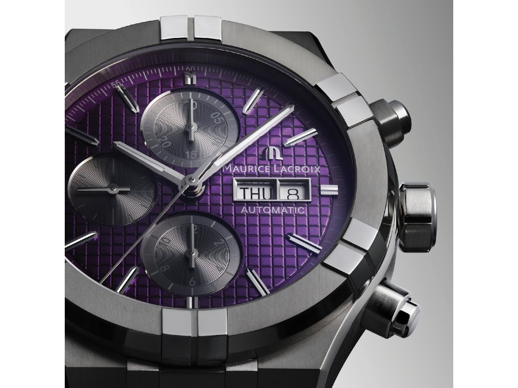 Nepřehlédnutelnou tváří nového Aikon Automatic Chronograph je fialová barva číselníku. Purple odstín se stává novým módním hitem, který Maurice Lacroix představuje mezi prvními. Výjimečnost modelu dodává provedení v titanu.