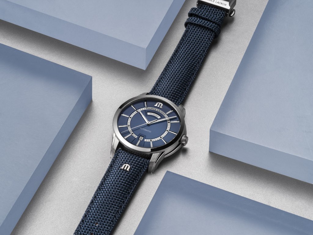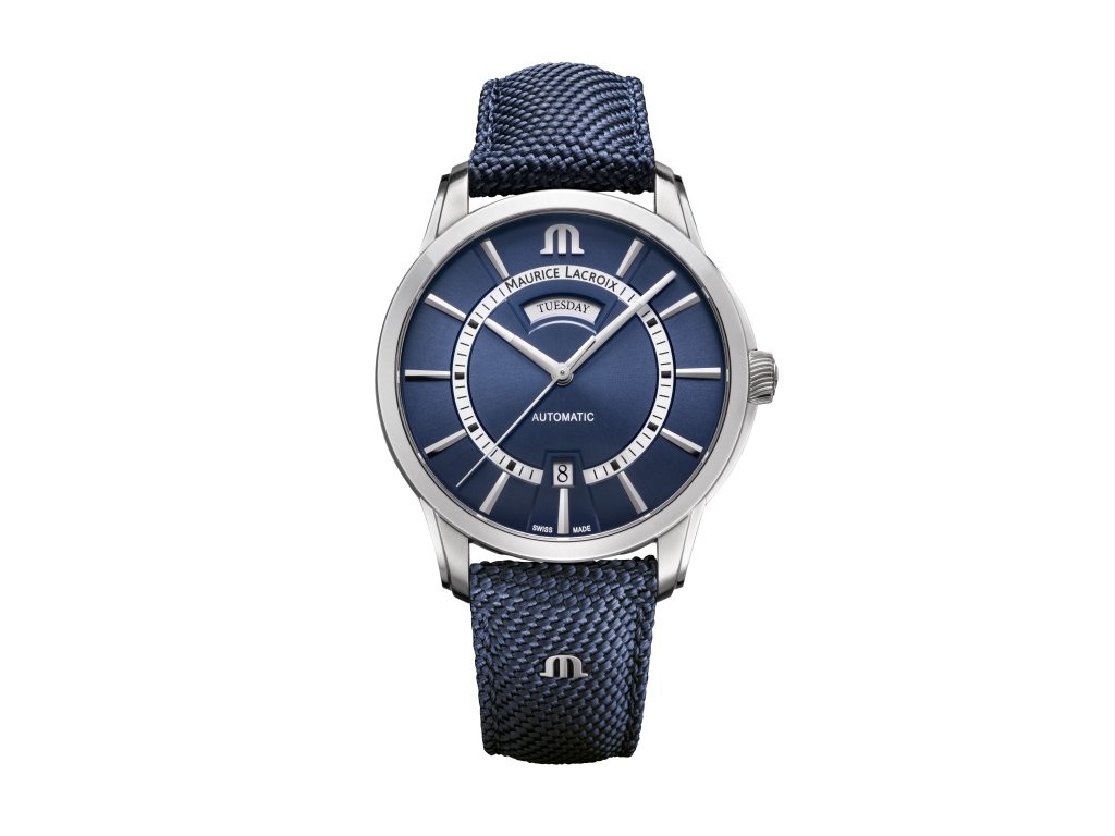 Elegantní automat Pontos Day/Date v atraktivním modrém provedení patří mezi nejžádanější verzi těchto pánských oblekovek. Barva oceli a modrých doplňků efektně kontrastuje. Nepřehlédnutelné je tak rovněž M na řemínku, díky němuž hodinky sebevědomě prezentují značku Maurice Lacroix. Ocelové pouzdro o průměru 41mm chrání automatický stroj a čistý, přehledný číselník, citlivě zdobený pouze středovou kružnicí a broušenými indexy. Strukturovaný nylonový řemínek doplňuje překládací spona pro maximální pohodlí.